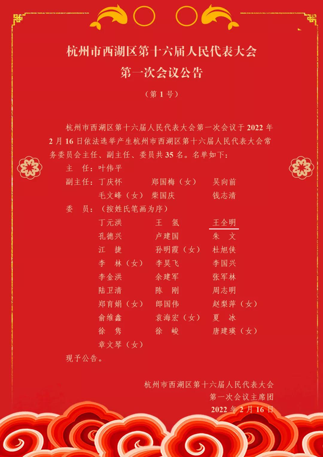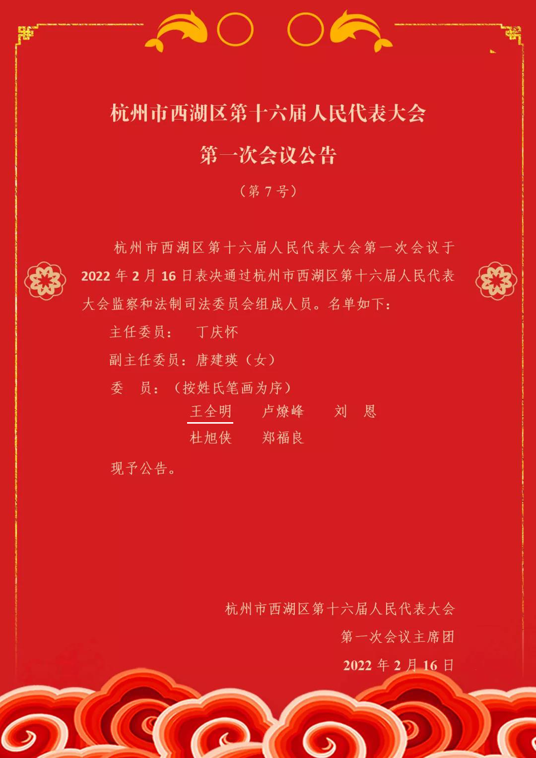 本所主任王全明律师当选杭州市西湖区第十六届人大常委会委员、人大监察和法制司法委员会委员。