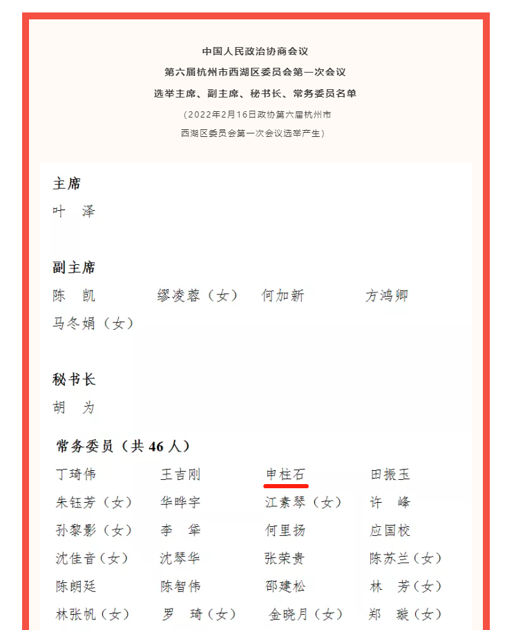 浙江金道律师事务所高级合伙人申柱石律师参加会议并当选中国人民政治协商会议第六届杭州市西湖区委员会常务委员。