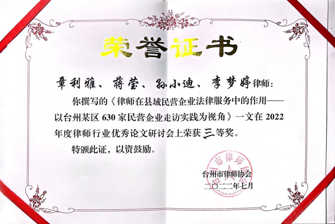 今后,金道台州分所将继续鼓励所内律师积极开展专业研究,撰写实务论文,参与各项论文评比活动,力争再创佳绩。