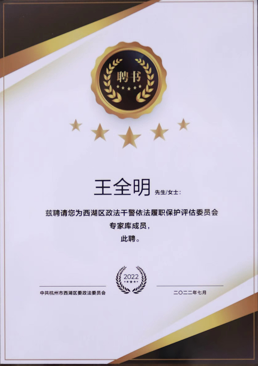 2022年7月,中共杭州市西湖区委政法委员会聘请浙江金道律师事务所主任王全明律师为西湖区政法干警依法履职保护评估委员会专家库成员