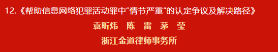 《帮助信息网络犯罪活动罪中“情节严重”的认定争议及解决路径》——袁昕炜、陈雷、茅莹 袁昕炜 金道所权益合伙人 陈雷 金道所律师 茅莹 金道所律师 《从审判实践看社会资本参与“土地一级开发”的成与败》——徐杨超、张阅、王钟秀 徐杨超 金道所高级合伙人 张阅 金道所权益合伙人 王钟秀 金道所律师