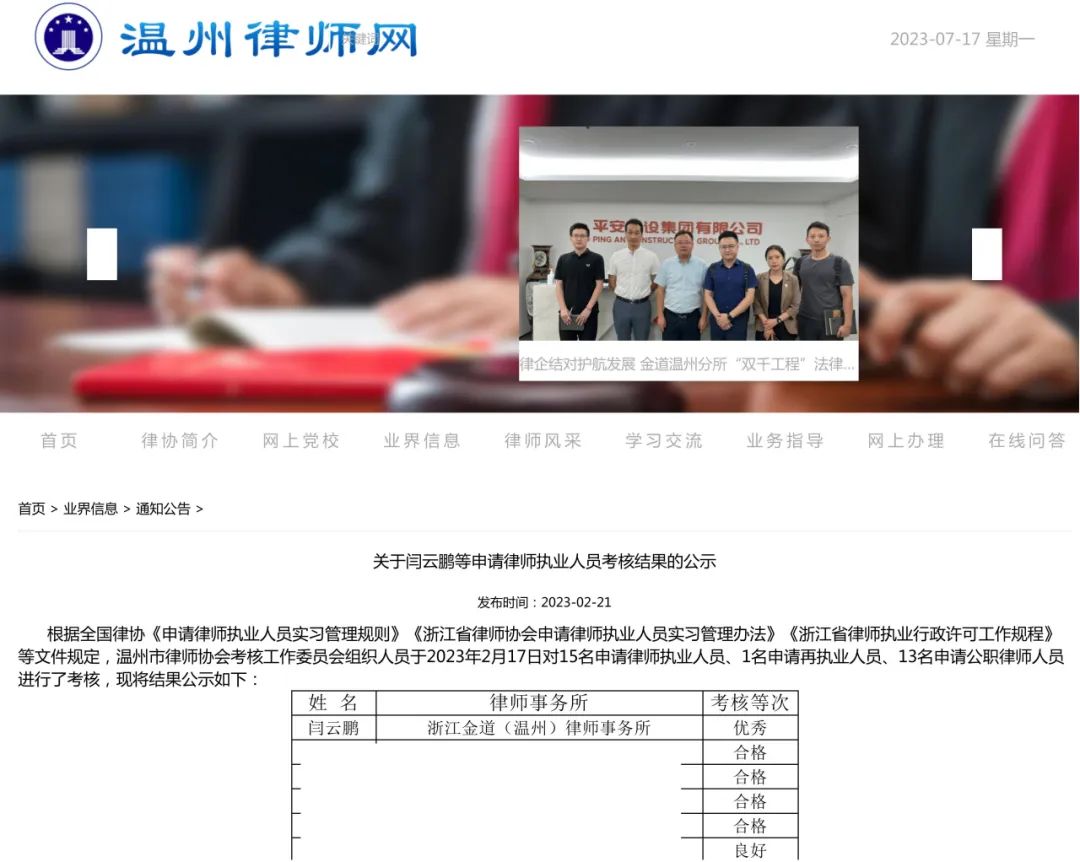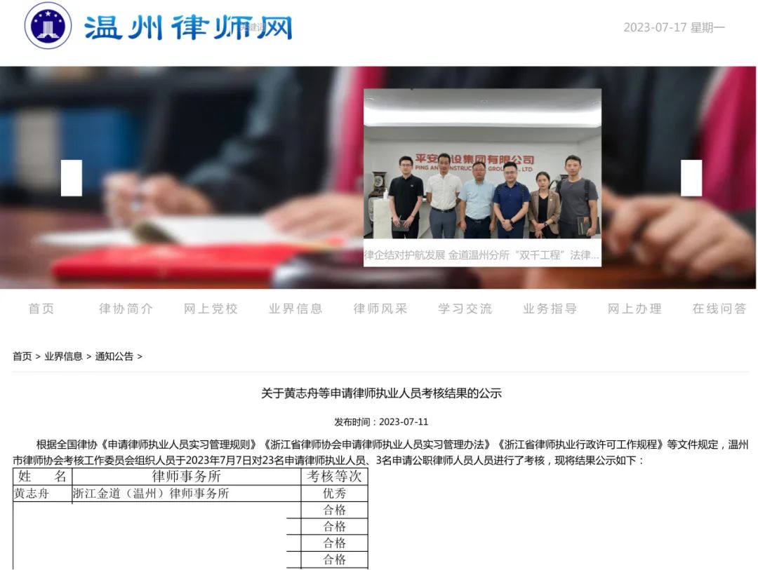在2023年温州市律师协会考核工作委员会组织的申请律师执业人员实习考核中,金道温州分所实习律师闫云鹏、黄志舟在当期实习考核中获优秀等次。每期实习考核均二十余人参加,优秀等次仅1人。