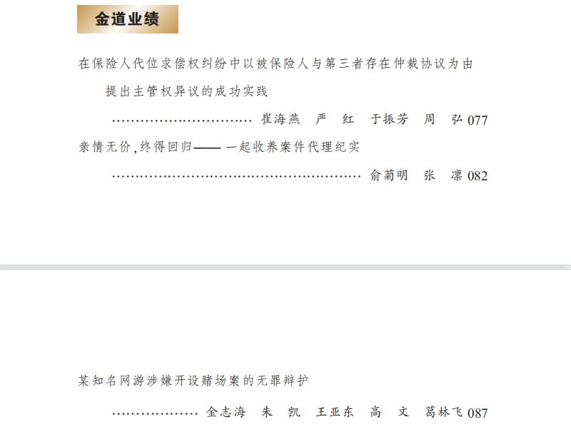 金道律师尤以争议解决擅长,我们一贯认为,律师不能埋头办案,还要将办案经验以可复制的方式写下来、分享出去。只有如此,才能博采众长,为客户带来更为优质的法律服务。本期金道业绩,我们选取了三个截然不同领域的典型案例,期待对您有所帮助。