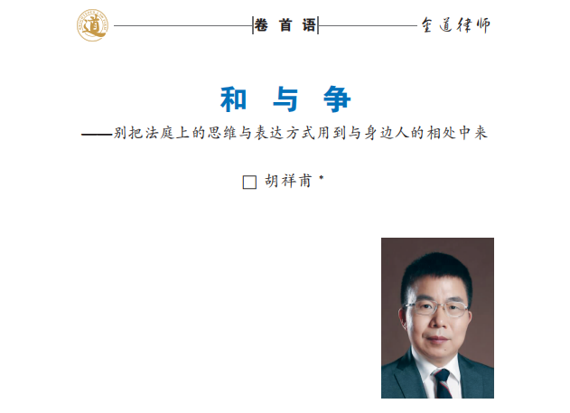 本期大咖之声,我们继续为大家带来本所首席合伙人胡祥甫律师撰写的《和与争——别把法庭上的思维与表达方式用到与身边人的相处中来》。胡首席殷切劝慰,“遇事,法为度;为人,情在心,希望法律人不仅能成为成功的律师,更成为受身边人欢迎的幸福之人。”