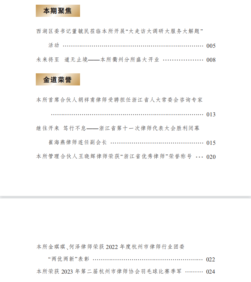 本期《金道律师》又是喜事连连的一期。本所衢州分所盛大开业,首席合伙人胡祥甫律师受聘担任浙江省人大常委会咨询专家,管理合伙人崔海燕律师连任浙江省律师协会副会长、温州分所党支部书记肖立峰律师当选常务理事,管理合伙人王晓辉律师荣获“浙江省优秀律师”荣誉称号……