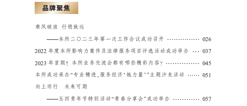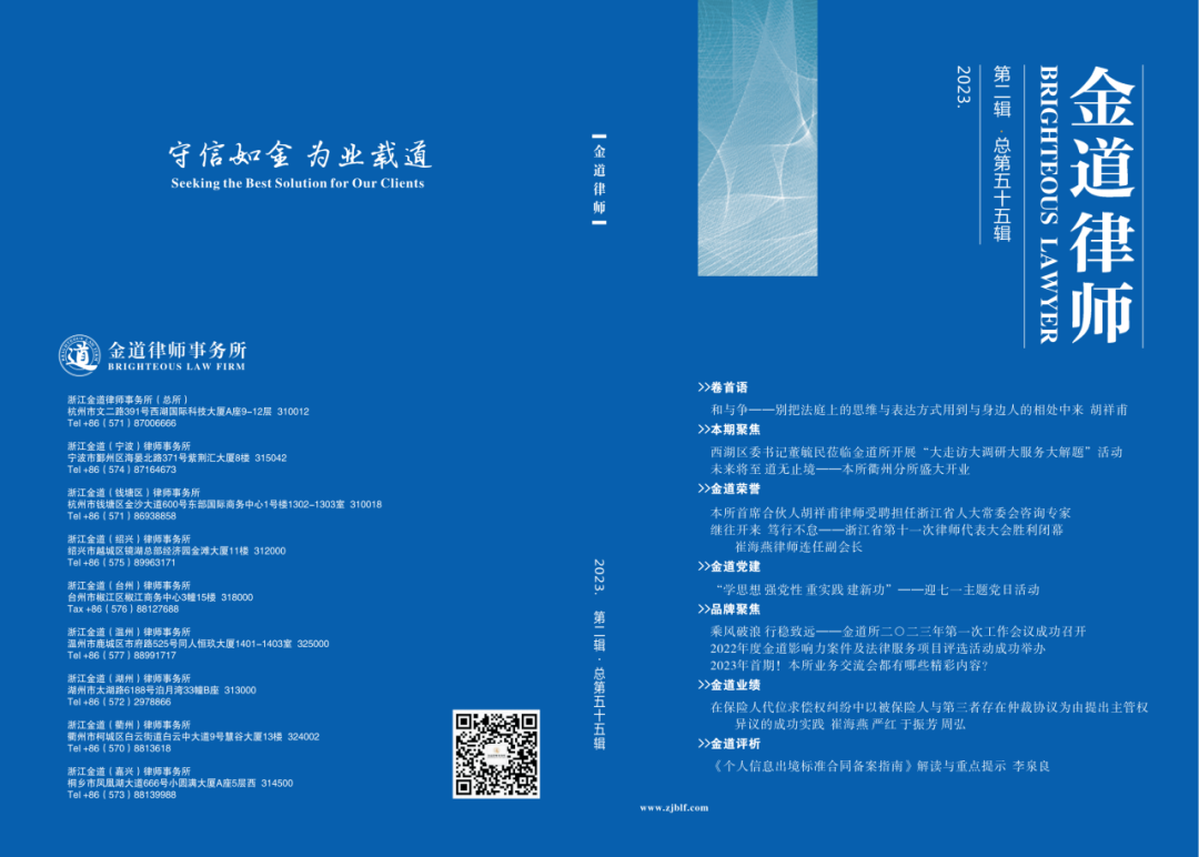 伴随着这承上启下的好时节,第55期《金道律师》顺利出刊。我们期待在这默默坚守的一方润土,能有更多知识的养料和灵感的骤雨,栽培出丰富的果实种类。