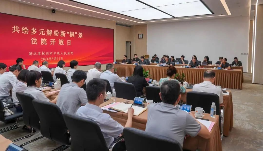 2024年9月11日上午,杭州中院举行“共绘多元解纷新‘枫’景”法院开放日活动。杭州中院党组书记、院长陈志君出席活动并讲话。市人大代表、政协委员、杭州中院监督员、律师代表、调解组织负责人和媒体记者等30余人走进法院,“零距离”体验、“沉浸式”感受。金道所管理合伙人、杭州市律师行业团委副书记郑梁参加活动并就“多元解纷”分享律师观点。