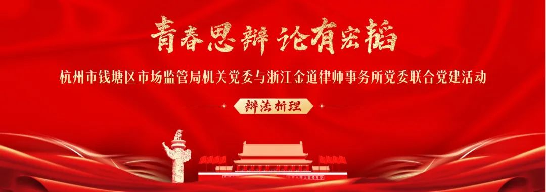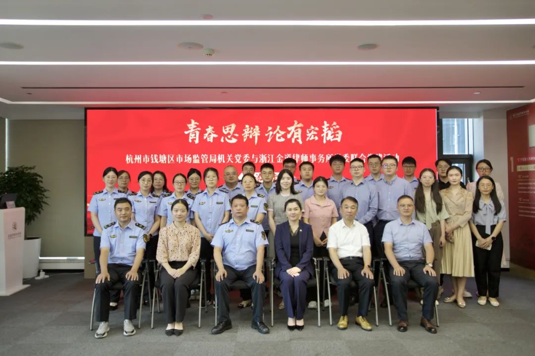 2024年9月18日,为积极推动“三支队伍”建设,提升法治专业素质和专业能力,同时进一步加强律师特别是青年律师对行政执法法律实务的理解,浙江金道律师事务所党委与杭州市钱塘区市场监督管理局机关党委联合开展“青春思辩·论有宏韬”辩法析理活动。钱塘区市场监管局党委委员、副局长钱燕锋,钱塘团区委副书记王芳,钱塘区市场监管局机关党委副书记、工会主席石正勇,金道所党委委员、管理合伙人徐杨超,高级合伙人、政府与行政专业委员会主任来晓明,团支部书记王杰等40余人参加本次活动。活动由金道所闵未若雁律师主持。