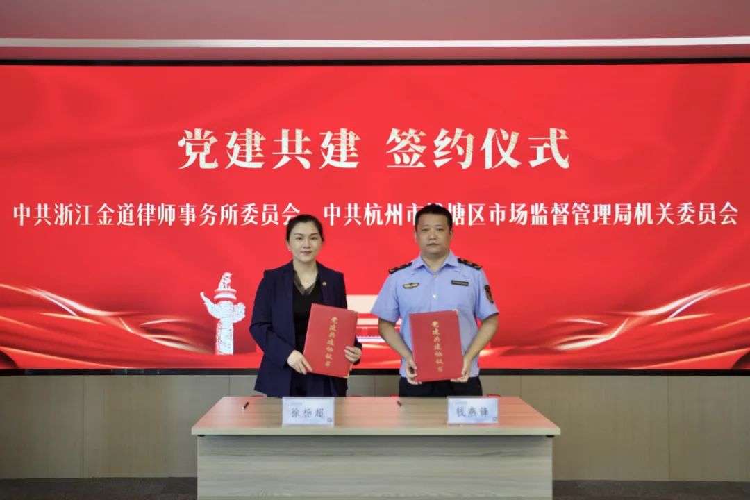活动伊始,徐杨超律师首先对杭州市钱塘区市场监管局各位领导和年轻干部的到来表示热烈欢迎。随后,为进一步强化党建引领,发挥党委的政治引领作用,金道党委和钱塘区市场监管局机关党委共同签署《党建共建协议》,这也标志着两家单位在党建工作中的深度合作,共同推进法治建设与专业人才培养。