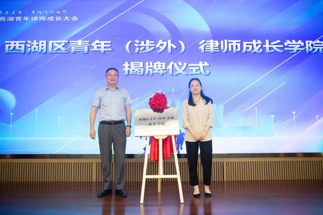 西湖区青年(涉外)律师成长学院揭牌成立仪式 会上,举行了西湖区青年(涉外)律师成长学院揭牌成立仪式,西湖区司法局党委书记、局长计玉妹为“成长学院”的成立作寄语。