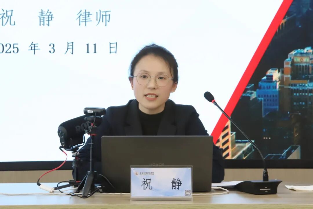 为主题,聚焦律师职业道德和执业纪律培训,强化律师的规范执业意识,促进行业健康发展。祝静律师详细梳理了行业查处情况、违规类型及违规案例,通过详实的数据与典型案例,揭示律师执业中的常见违规行为及其严重后果。而后,祝律师介绍了合规执业的基本原则与要求,为律师规范执业提供了清晰指引。祝律师倡导律师应坚守职业道德和执业纪律,以规范执业为基石,为个人在行业中的长远发展及法治社会的建设贡献力量。