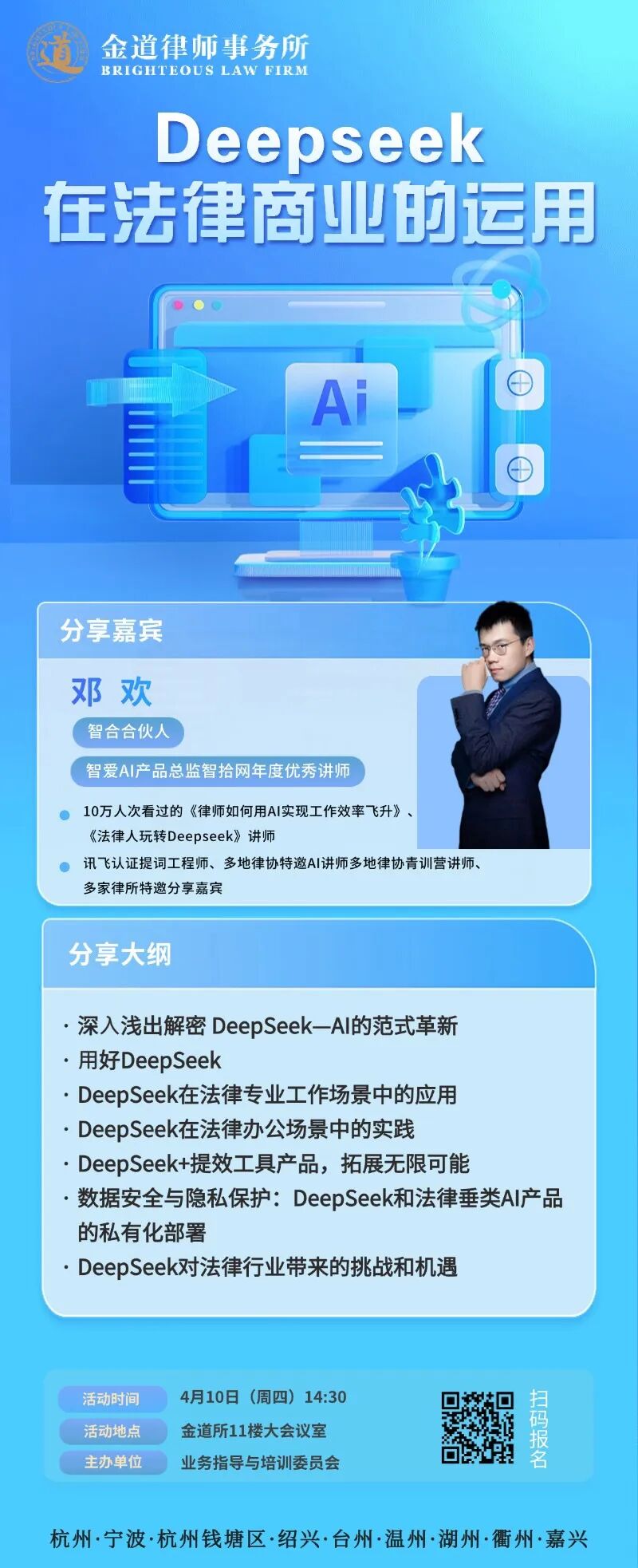 邀请函 | 4月10日,“Deepseek在法律商业的运用”专题培训