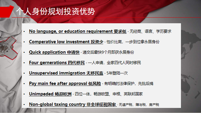 马耳他曾为英国的殖民地,英语普及率高达90%。马耳他当地居民文化程度较高、包容性强,且拥有国际公认标准的优质教育体系,沿袭传统英式教育,教育支出占GDP总量的13.5%。同时,马耳他移民程序简单、便捷,移民项目全面、安全。前述诸多因素都吸引越来越多的个人将马耳他作为其个人身份规划投资的目的国。