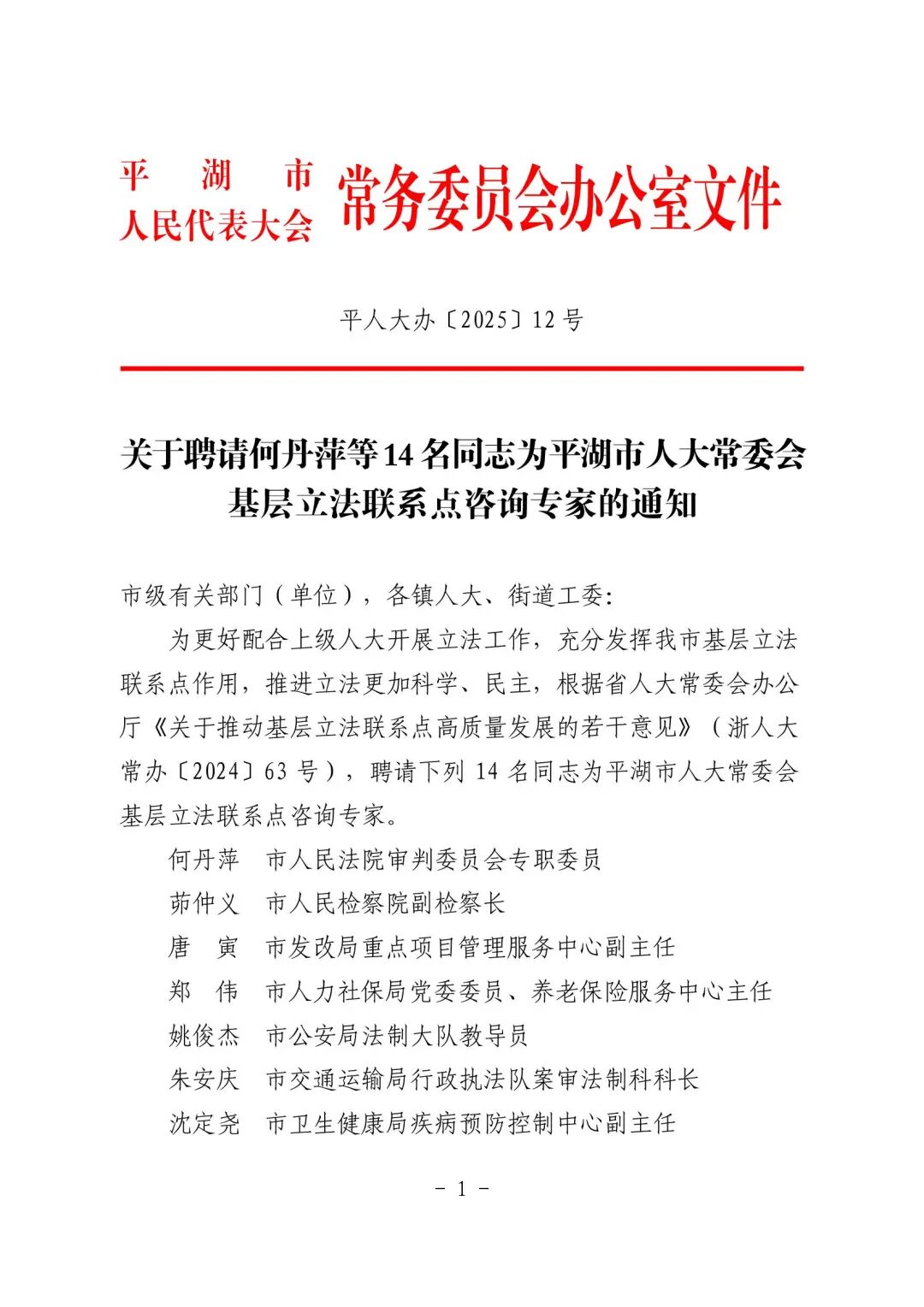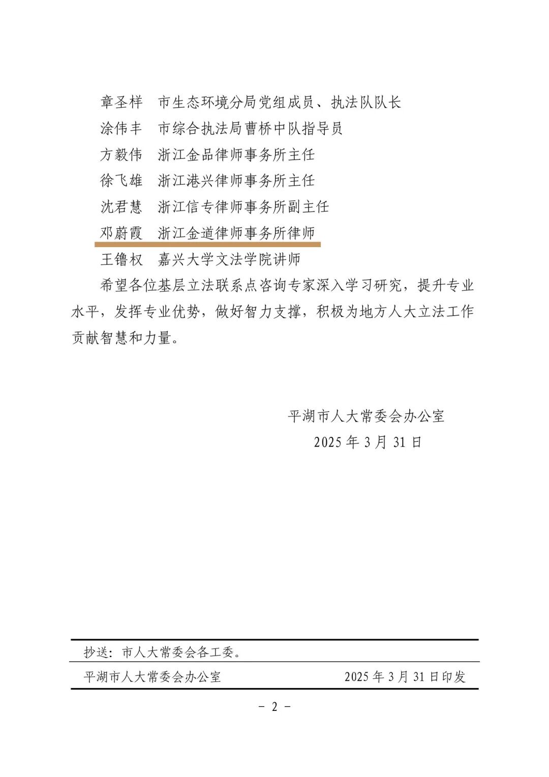 邓蔚霞律师受聘担任平湖市人大常委会基层立法联系点咨询专家 为更好配合上级人大开展立法工作,充分发挥平湖市基层立法联系点作用,推进立法更加科学、民主,根据省人大常委会办公厅《关于推动基层立法联系点高质量发展的若干意见》(浙人大常办〔2024〕63 号),聘请14名同志为平湖市人大常委会基层立法联系点咨询专家。金道所邓蔚霞律师受聘担任平湖市人大常委会基层立法联系点咨询专家。