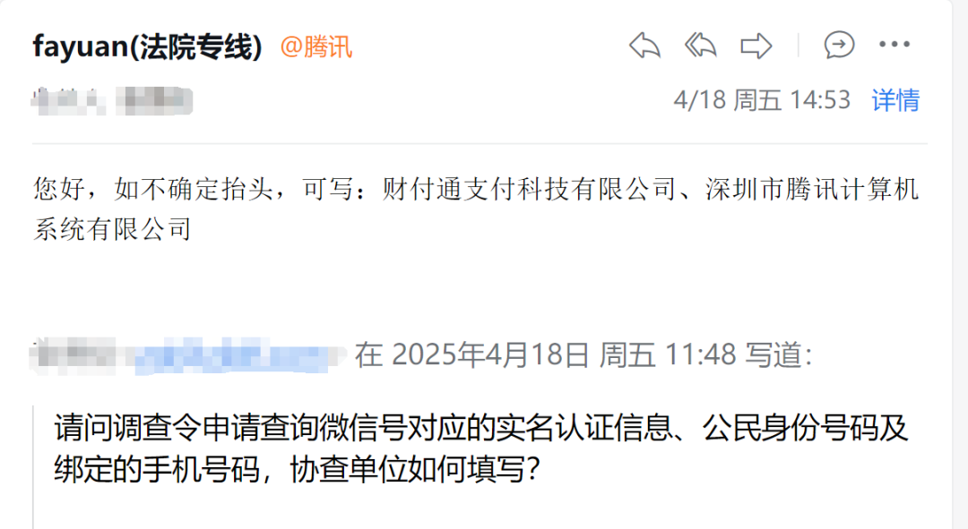 2.关于调查令抬头(协查单位),如查询事项涉及微信交易流水信息、微信钱包余额及绑定银行卡信息的,协助调查单位为:财付通支付科技有限公司。如查询事项涉及到微信注册信息的,协助调查单位为:深圳市腾讯计算机系统有限公司。如查询事项涉及理财产品的,协助调查单位为:腾安基金销售(深圳)有限公司。如不能确定协查单位的,建议都写上,以防万一。
