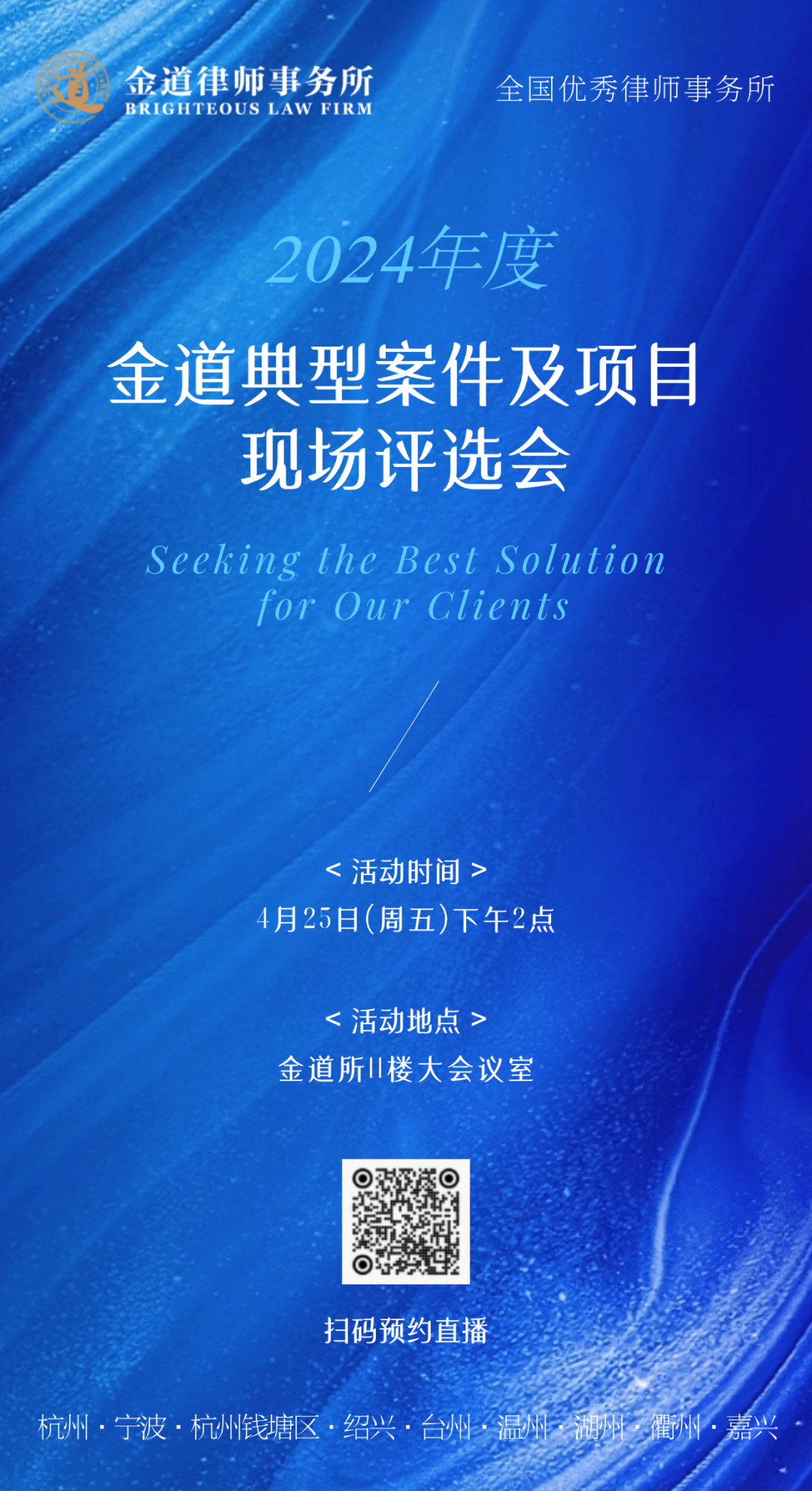 以案载道,笔述春秋。为凝炼法律服务的精微匠心,赓续专业传承的星火之光,并为2025年《诉之有道:金道典型案件和项目承办策略与技艺》的出版做充实准备,2025年4月25日,金道所将举办2024年度金道典型案件及项目现场评选会。通过每年举办典型案件及项目评选活动,既让总分所同仁在经典案例的星辉里照见办案艺术的万千气象,亦向社会展现金道律师如何将法律条文淬炼成破局重生的密钥。本次评选会首次通过视频号对外同步进行直播,搭建无界法堂,欢迎大家扫描下方二维码预约直播,精彩不容错过。