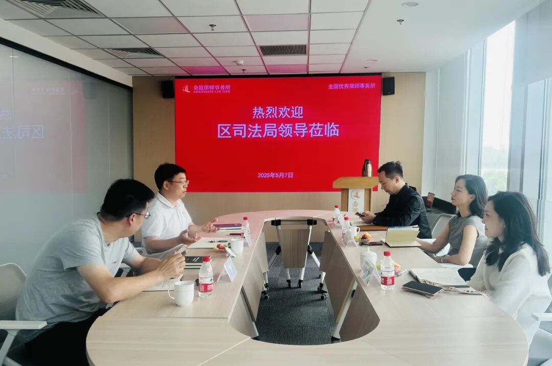 2025年5月7日,钱塘区司法局副局长许宏波、司法行政科科长王伟一行莅临浙江金道(钱塘区)律师事务所调研指导。金道杭州钱塘区分所主任陈思,党支部书记、副主任王韬,副主任吕枫丽参加接待。会上,陈思主任首先对许宏波副局长一行的到来表示热烈欢迎,随后就金道杭州钱塘区分所的创办初衷、发展目标以及党团建设、业务特色、社会责任和律师荣誉等情况进行了介绍。