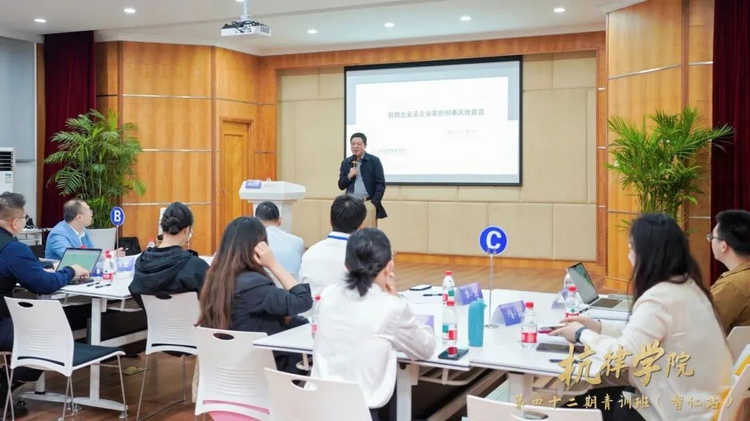 2025年4月26日上午,杭律学院第四十二期青训班的学员们迎来特殊一课——浙江金道律师事务所高级合伙人、浙江省律师协会刑事专业委员会顾问胡东迁带来《初创企业及企业家的刑事风险防范》专题讲座。本期青训班由杭州律师学院、杭州市律师协会教育培训委员会主办,聚焦法律实务前沿,助力青年律师拓宽行业视野。
