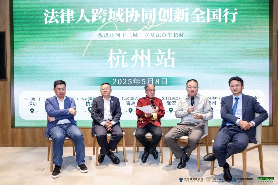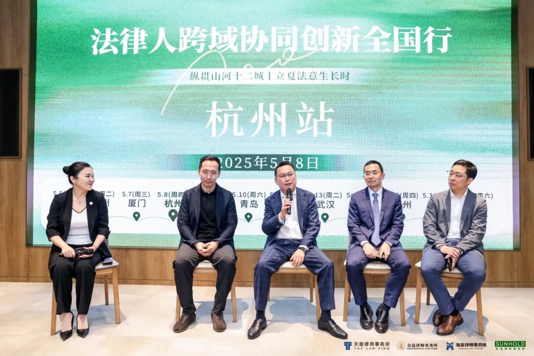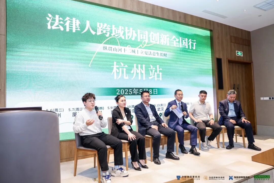 2025年5月8日,“十二天十二城·2025法律人跨域协同创新全国行”第四站走进杭州。2025法律人跨域协同创新全国行活动旨在搭建起一座连接校园、律所和企业交流的桥梁,探讨各个阶段法律人发展的困惑,开创律师行业内各律所、律师之间业务合作的新模式。本次杭州站活动由浙江天册律师事务所、浙江金道律师事务所、浙江海泰律师事务所、上海申浩律师事务所联合主办,嘉宾们围绕产业发展、业务创新、律所合作以及团队凝聚力等方面展开深入交流,探讨发展难点与破解之道。