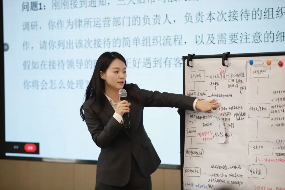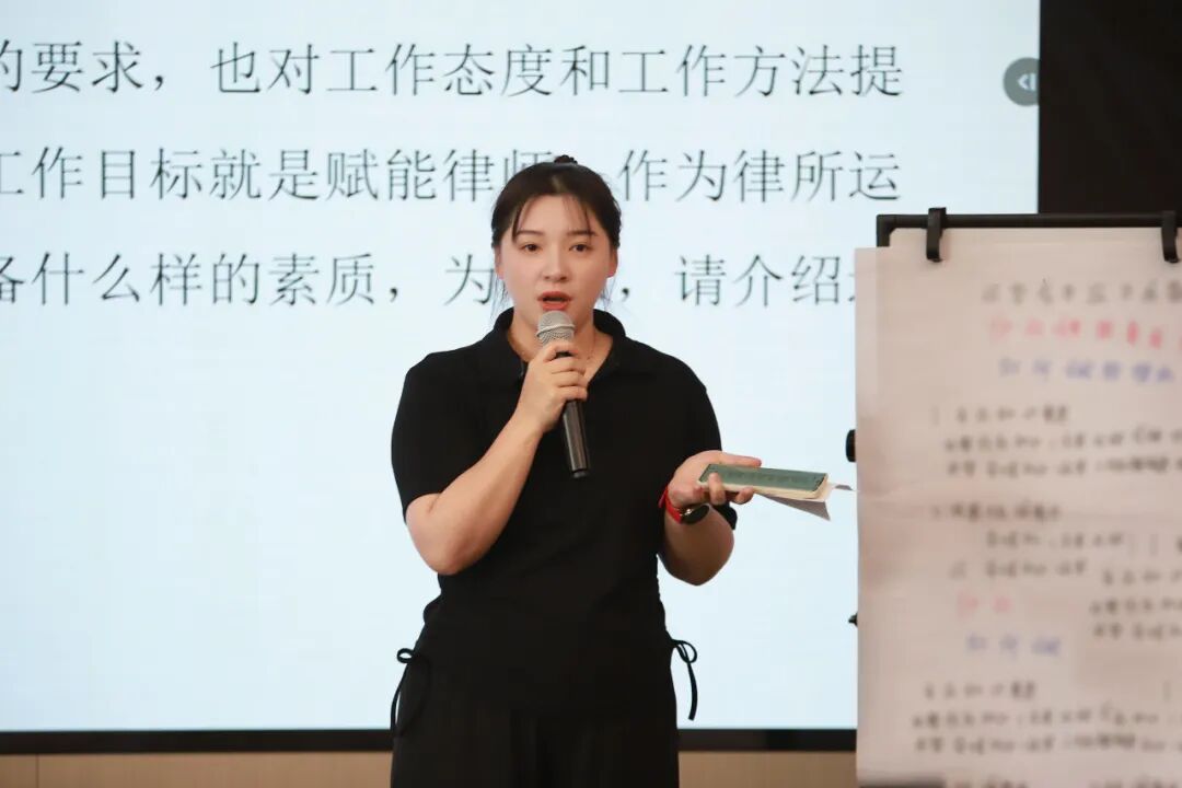 分组讨论环节,围绕“会务接待”“大型活动组织策划”“工作体系建立”“运营赋能律师”等主题延展出的四个问题,四个小组随机抽取,并对抽取到的问题迅速展开热烈讨论。大家分工协作,配合无间,在规定的时间内产出成果,最后上台依次进行展示。