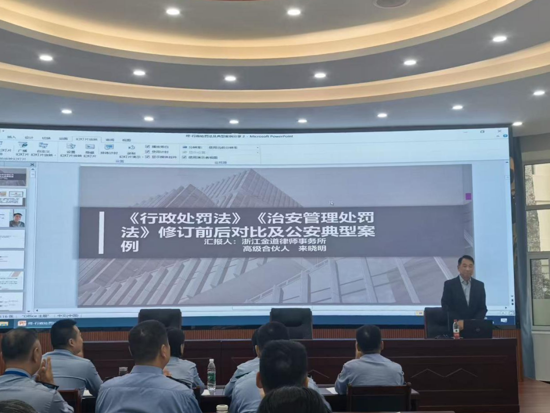2025年9月24日,金道所高级合伙人来晓明受中国人民警察大学邀请,在中国人民警察大学为浙江省公安厅督审总队条线的民警作《〈行政处罚法〉〈治安管理处罚法〉修订前后对比及公安典型案例》主题讲座。