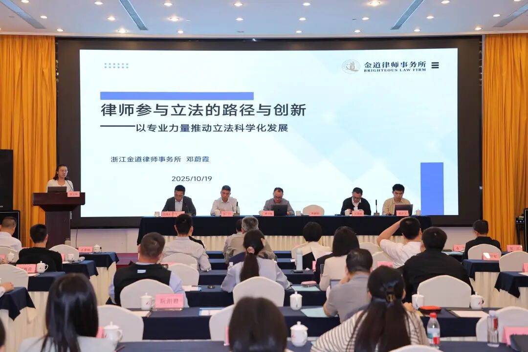 邓蔚霞律师受邀在省法学会宪法与地方立法学研究会2025年学术年会上作主题分享 2025年10月19日,由省社会科学院、省法学会宪法与地方立法学研究会主办,以“设区的市地方立法10周年:实践回顾与高质量发展展望”为主题的省法学会宪法与地方立法学研究会2025年学术年会在杭州召开,汇聚了来自省内外学界、立法实务界的近百位代表。金道所邓蔚霞律师受邀参会,并在会议“第三单元:立法实践创新与主体参与”中作《律师参与立法的路径与创新》主题分享。