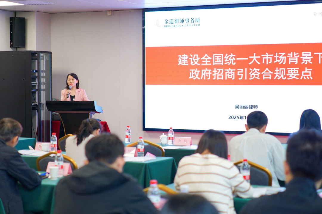 吴丽丽律师应深圳市福田区投资促进局邀请讲授《建设全国统一大市场背景下的政府招商引资合规要点》 2025年10月22日,金道所吴丽丽律师应深圳市福田区投资促进局邀请为深圳市福田区招商工作能力提升专项研讨班讲授《建设全国统一大市场背景下的政府招商引资合规要点》,深圳福田区投资局领导、工作人员及辖区各单位、镇街招商干部参加研讨班学习。