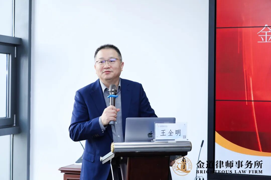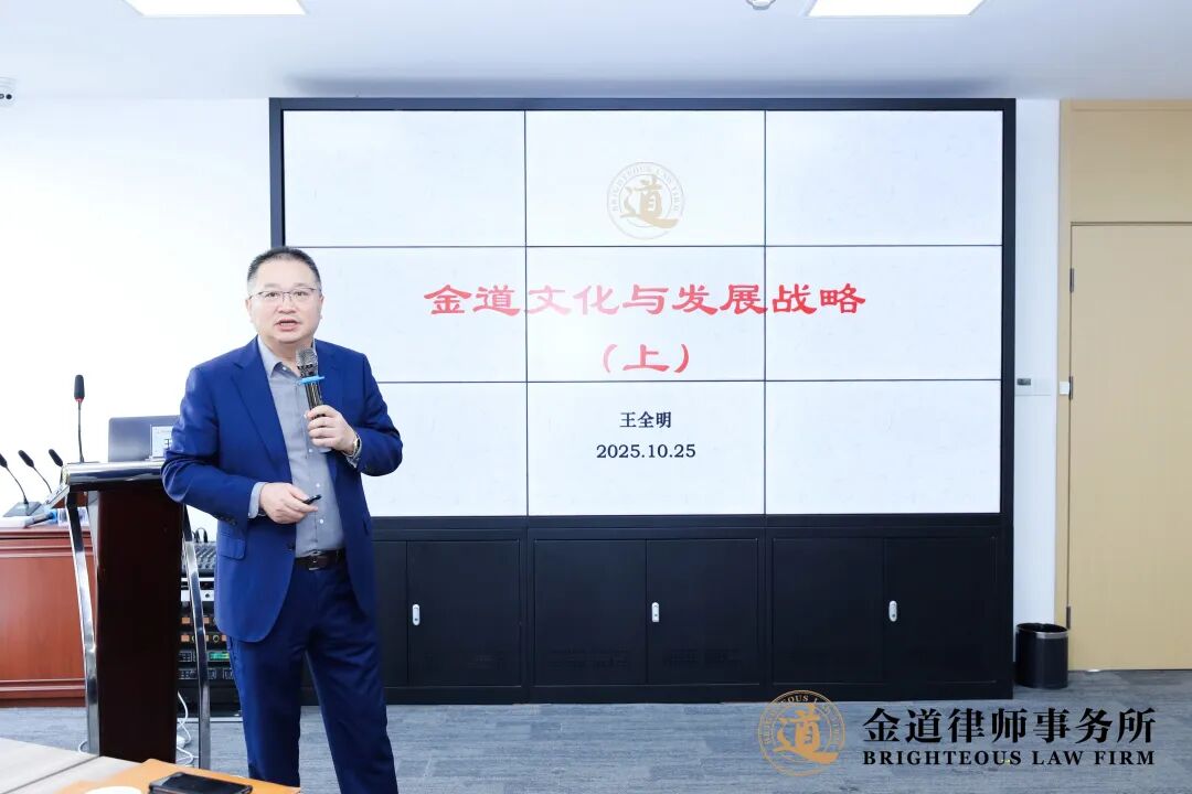 开班仪式结束后,王全明主任为学员们带来开班第一课《金道文化与发展战略》。他从金道学院的发展功能出发,围绕金道所近二十载的奋进征程,深入阐释了金道所实现高质量发展的深层逻辑以及始终秉持“守信如金,为业载道”的文化初心。他提出,破局发展、实现可持续是金道所未来关键课题,为此,金道所始终围绕“专业为本、创造价值”“以人为本、利他精神”“求真务实、创新进取”这一文化内核深耕发力,全力绘就新时代标杆律所的发展新画卷。最后,王主任寄语各位学员,期望大家以金道所的文化理念为引领,砥砺前行,成长为具有金道特质的“金牌律师”。