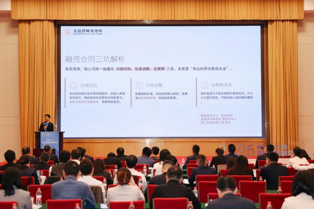 中华全国律师协会副会长盛雷鸣,浙江省司法厅党委委员、副厅长、省律师行业党委书记徐晓波,共青团浙江省委副书记、省青联主席李莲萍出席会议并讲话。浙江省律师协会副会长、青年律师工作委员会主任张震宇,浙江省律师协会青年律师工作委员会副主任刘慧杰分别主持开幕式、闭幕式。上海市律师协会副会长陆胤、江苏省律师协会副会长蔡斌、安徽省律师协会副会长张晓健、云南省律师协会副会长李泽春、新疆维吾尔自治区律师协会副会长陈镭带队参会。金道所郑梁、何泽、滕俊超、黎娟、王欣、陈沈熠、方文韬、范木子,杭州钱塘区分所胡微,台州分所朱艇,温州分所肖立峰等参加活动。同时,郑梁律师受邀在“成熟科创企业的法律陪伴”主题中,围绕投融资等问题进行了主题分享解答。