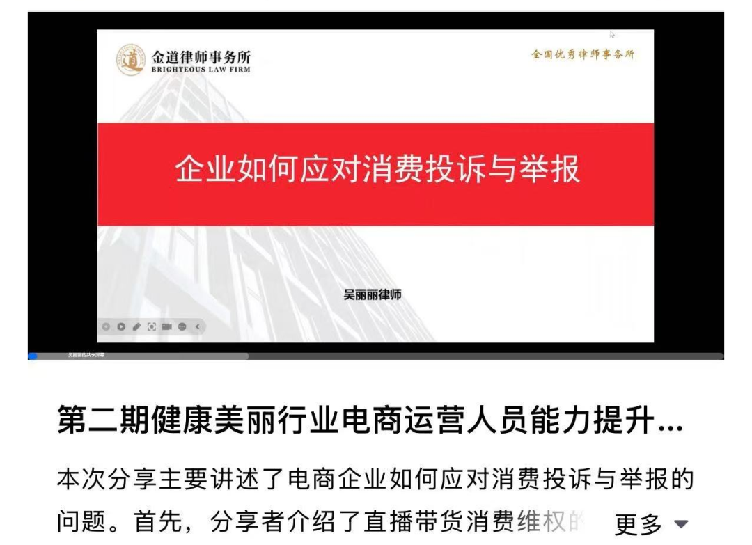 吴丽丽律师应邀为健康美丽行业电商运营人员能力提升培训班线上讲授《企业如何应对消费投诉与举报》 2025年10月25日,金道所吴丽丽律师应浙江省健康产品化妆品行业协会电商分会邀请为健康美丽行业电商运营人员能力提升培训班线上讲授《企业如何应对消费投诉与举报》。