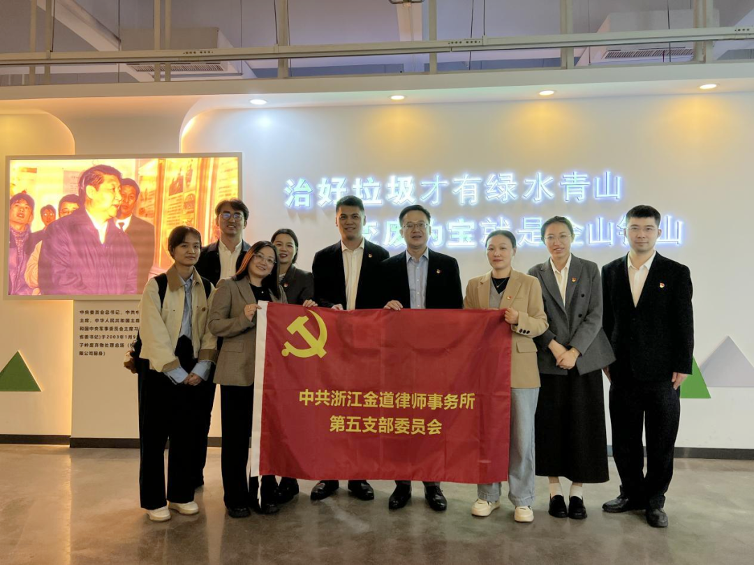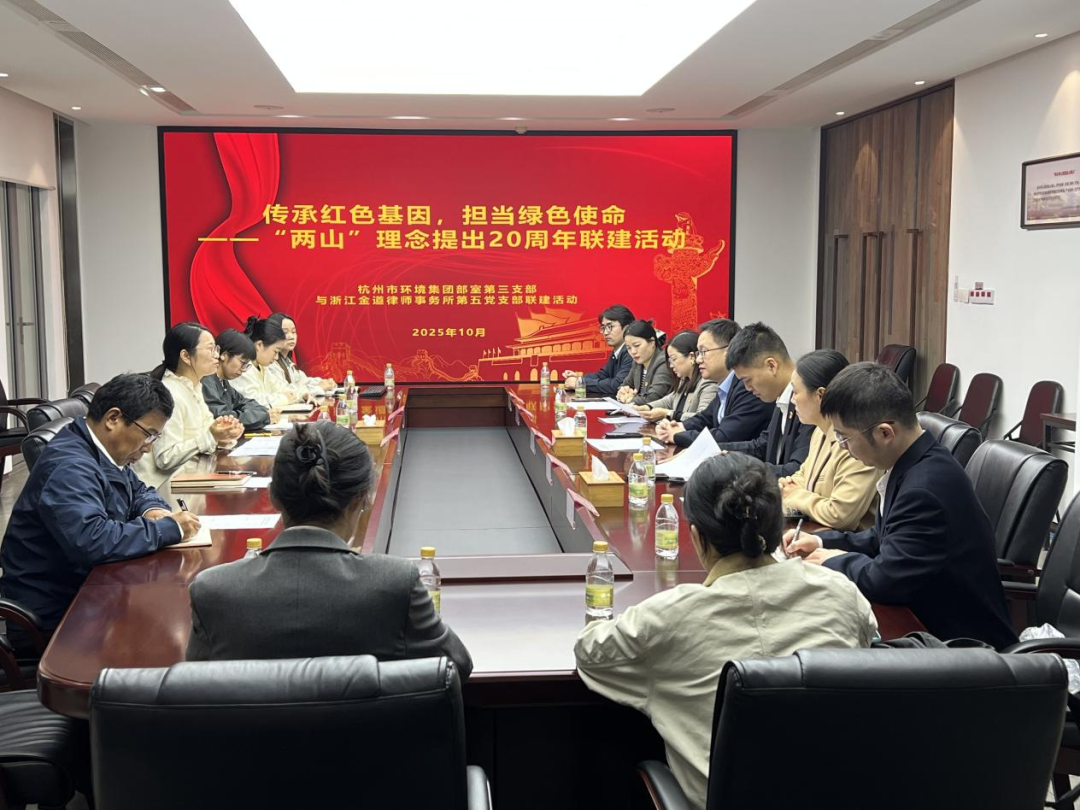 2025年是“绿水青山就是金山银山”理念提出20周年,为隆重纪念这一重要时刻,深入挖掘并领会“两山”理念的深刻内涵与时代价值,中共浙江金道律师事务所第五支部委员会与中共杭州市环境集团有限公司部室第三支部委员会联合组织开展践行“两山”理念党建联建活动。金道所党委副书记兼组织委员陈能达,第五党支部书记王磊,副书记沈发玲,委员金英、朱红梅等党员参加本次活动。