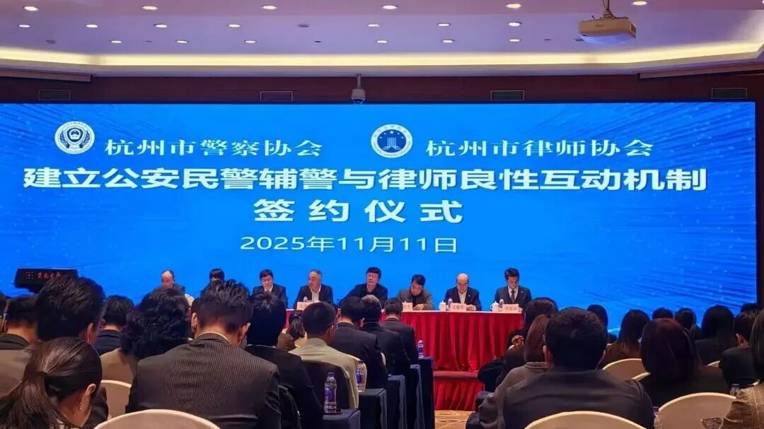 2025年11月11日,杭州市警察协会与杭州市律师协会共同举办“建立公安民警辅警与律师良性互动机制签约仪式”。市警察协会常务理事、理事,各区、县(市)警察协会负责人和特约法律服务点律师事务所、律师服务团等160余人齐聚一堂,共同见证这一重要时刻。