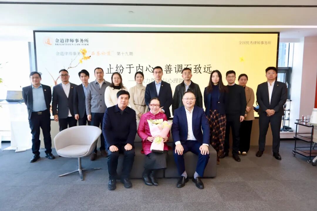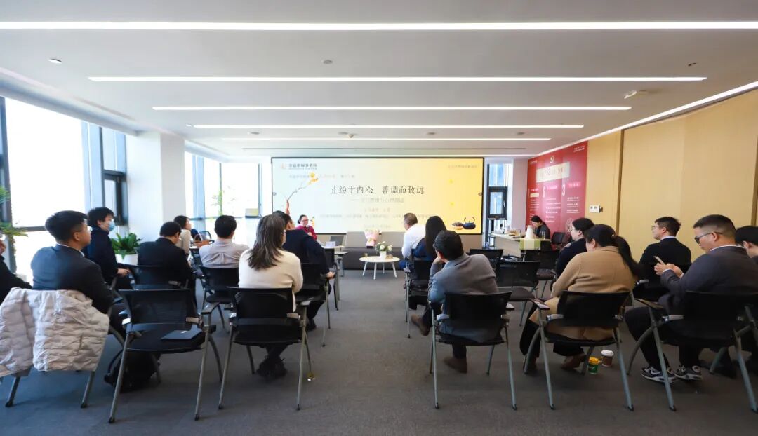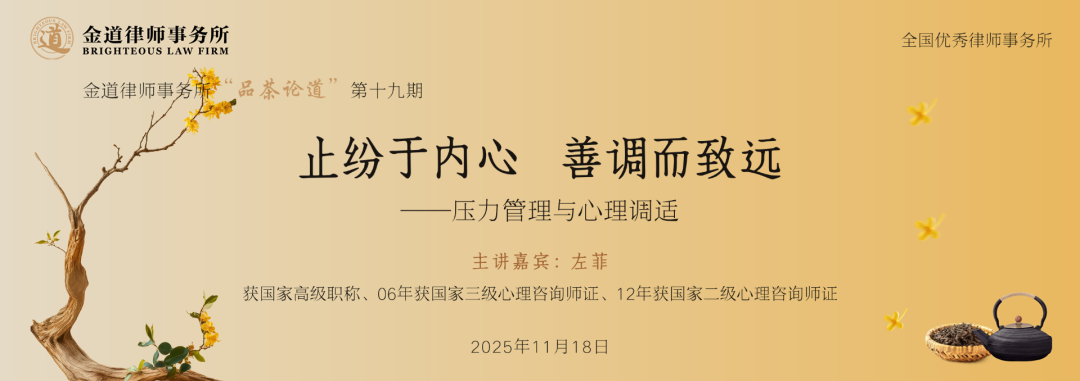 2025年11月18日上午,为了关心关爱客户和员工的身心健康,帮助大家在快节奏的工作中有效管理压力,金道所特邀国家二级心理咨询师、浙江大学领导干部培训课程长期特邀讲师、上海交通大学等高校特聘教授、中和心理工作室负责人之一左菲老师做客金道所第十九期“品茶论道”栏目,作《止纷于内心,善调而致远——压力管理与心理调适》主题分享。金道所党委书记、主任王全明,管理合伙人江力,平台建设与业务拓展委员会主任陆原等20多位合伙人、律师参加本次活动。活动由金道所律师助理戴思琦主持。