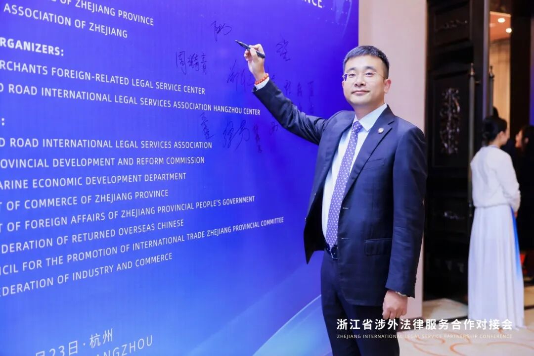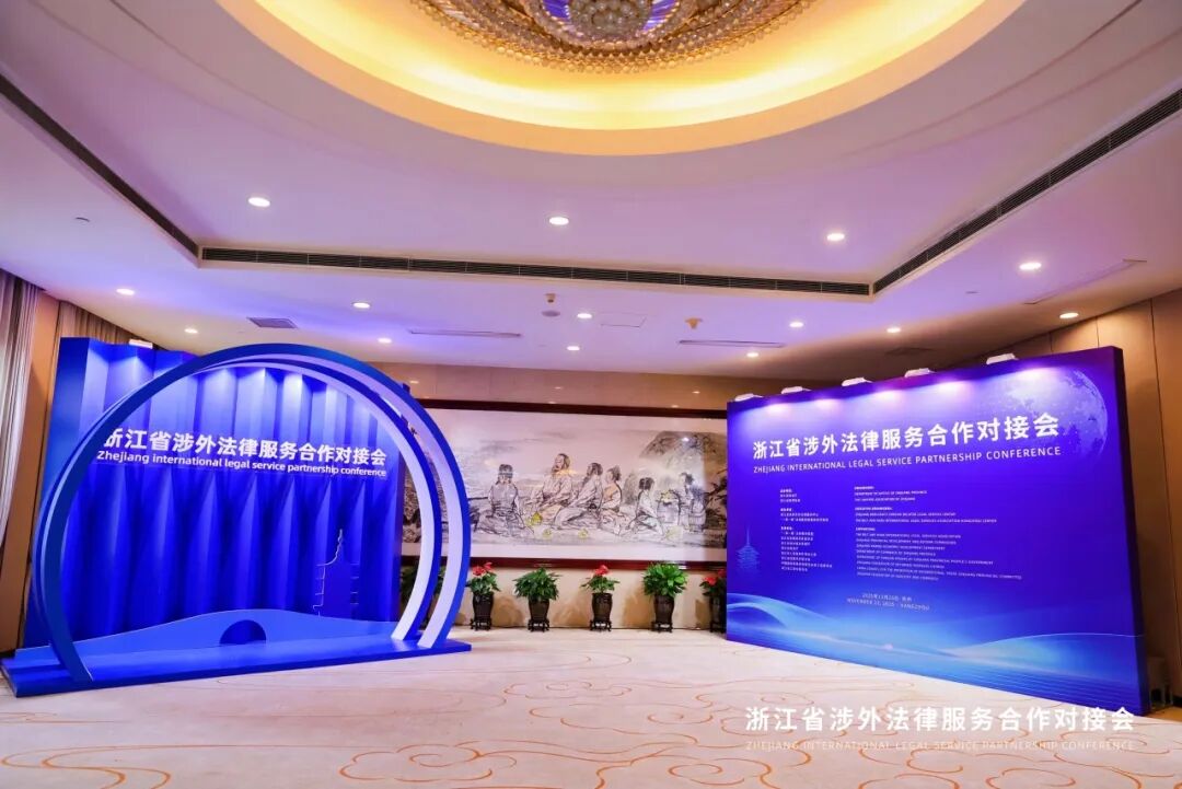2025年11月23日下午,浙江省涉外法律服务合作对接会在杭州成功举办,浙江省浙商涉外法律服务中心宣布正式运行。浙江省委常委、政法委书记王成国,浙江省人民政府副省长杨青玖,外交部原副部长乐玉成,司法部公共法律服务管理局局长杨向斌等领导出席会议。北马其顿共和国驻华大使萨什科·纳赛夫、哈萨克斯坦共和国驻华公使衔参赞阿斯卡尔·沙尔卡尔巴耶夫、乌兹别克斯坦共和国驻华参赞萨尔多尔·西罗若夫、印度工商联合会主席及中国会长阿都尔·达拉果地等外方嘉宾出席会议并致辞。香港特别行政区政府律政司司长林定国通过视频方式致辞。省直有关单位领导,省司法厅班子成员和部门负责人,“一带一路”法律服务联盟各代表处负责人,省、市律师协会相关领导和律师代表、相关高校代表、企业家代表等参加会议。金道所副主任崔海燕、权益合伙人陆原、兼职律师白龙等参加会议。