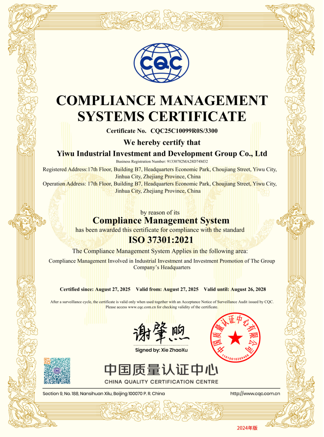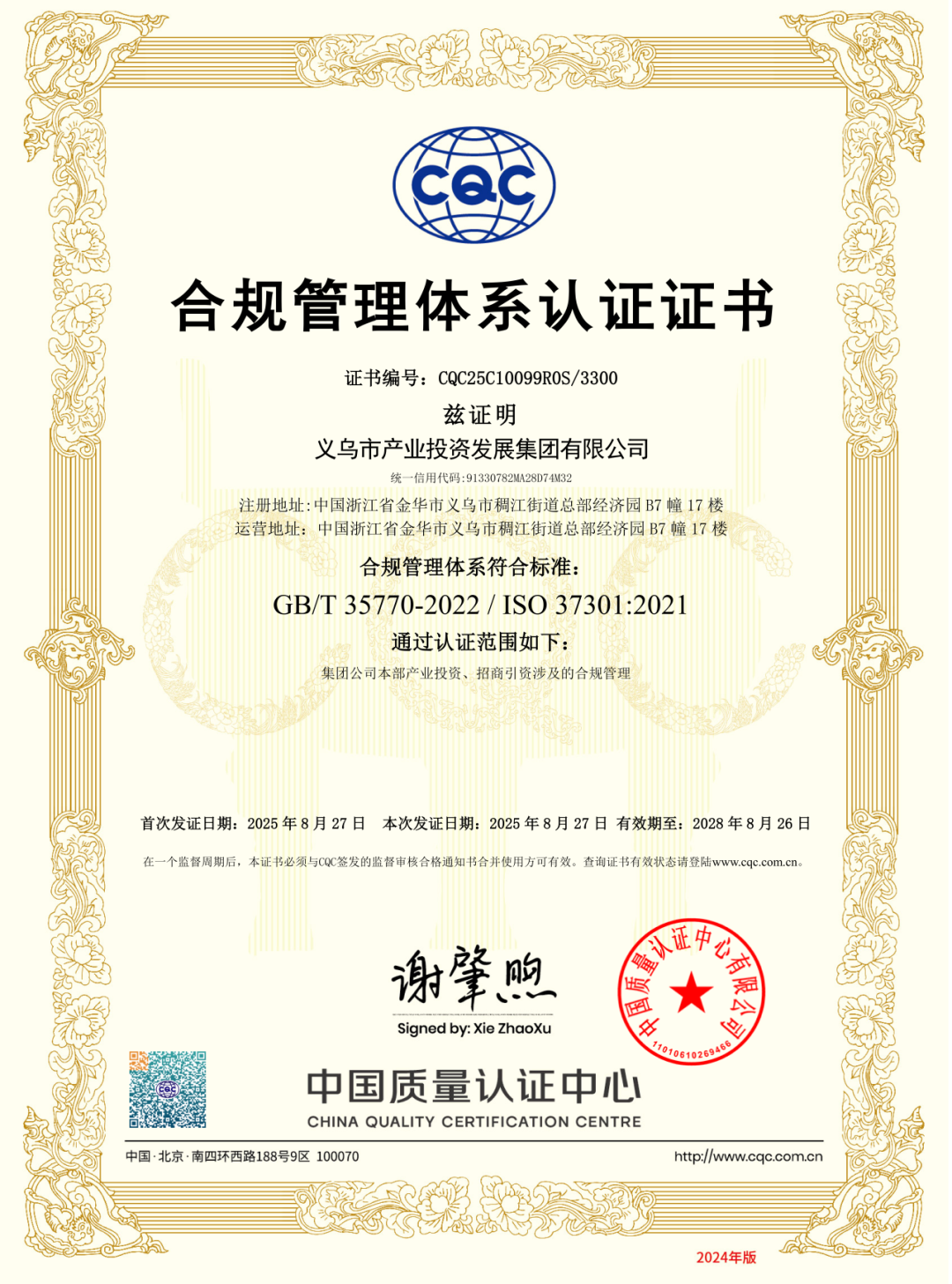 经过严格的内部审核、管理评审及认证机构的现场审核,义乌产投集团的合规管理体系被确认完全符合ISO 37301和GB/T 35770标准的所有要求,最终成功获得双认证。该认证是对集团合规管理体系建设成果的权威认可,证明了其合规管理体系具备了充分的适宜性、充分性和有效性。