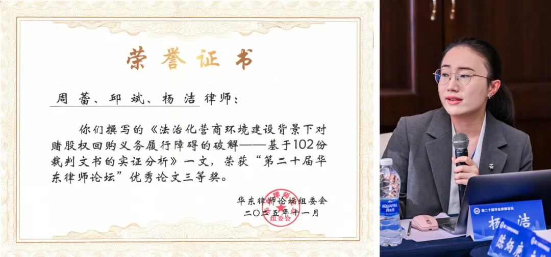 本届论坛集结成册论文105篇,设立党建引领律师行业发展新征程、新质生产力赋能与行政法律服务创新、民营经济高质量发展的刑事司法保障和辩护代理工作、民商法治新趋势与金融证券法律业务数字化转型、全球视野下的跨境法律服务等五个分论坛。在本届论坛上,金道所周蕾、邱斌、杨洁律师撰写的《法治化营商环境建设背景下对赌股权回购义务履行障碍的破解——基于102份裁判文书的实证分析》一文荣获“第二十届华东律师论坛”优秀论文三等奖。同时,杨洁律师在分论坛四“民商法治新趋势与金融证券法律业务数字化转型”上围绕获奖论文进行了交流分享。