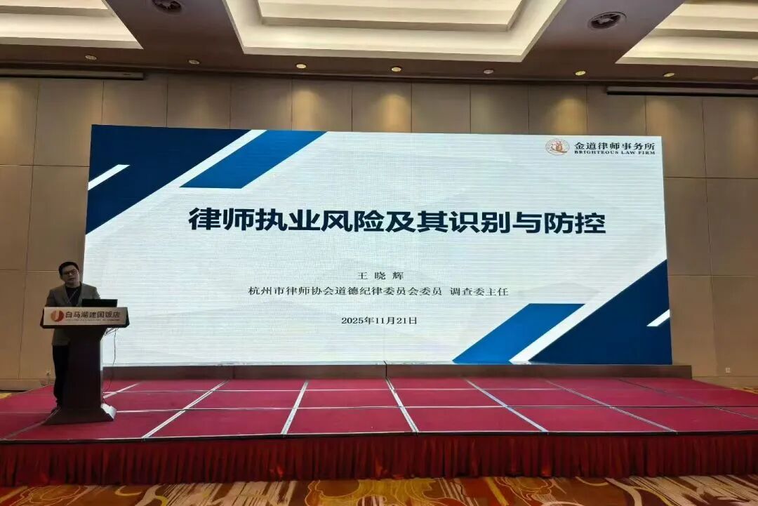 王晓辉律师受邀为滨江区新执业律师、实习律师进行职业道德执业纪律培训 2025年11月21日,金道所管理合伙人王晓辉受滨江律工委邀请,为滨江270余名新执业律师、实习律师作《律师执业风险及其识别与防控》专题讲座。