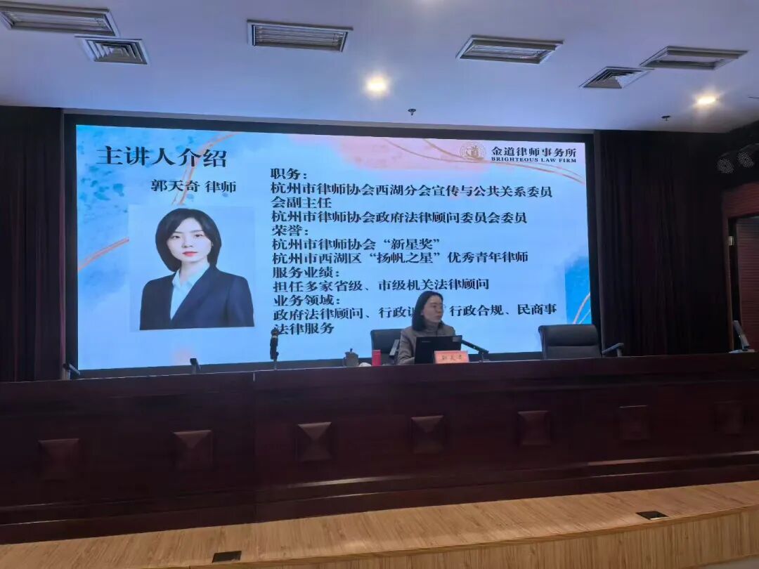 郭天奇律师受邀为杭州西湖风景名胜区综合指挥保障中心作主题讲座 2025年11月25日,金道所初级合伙人郭天奇受邀为杭州西湖风景名胜区综合指挥保障中心作《法律就在我们身边:日常工作中的法律知识》主题讲座。