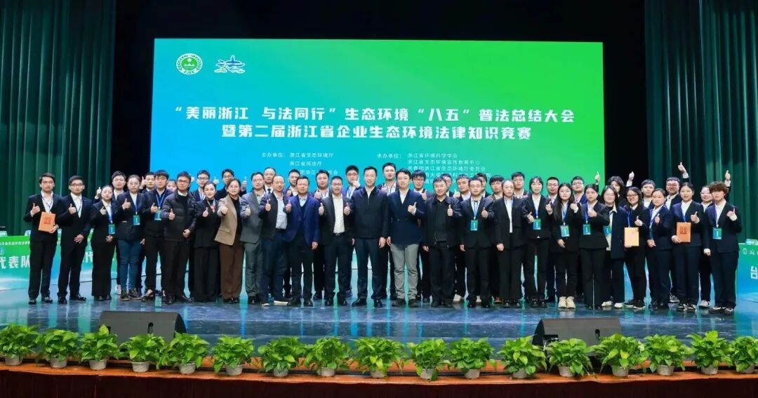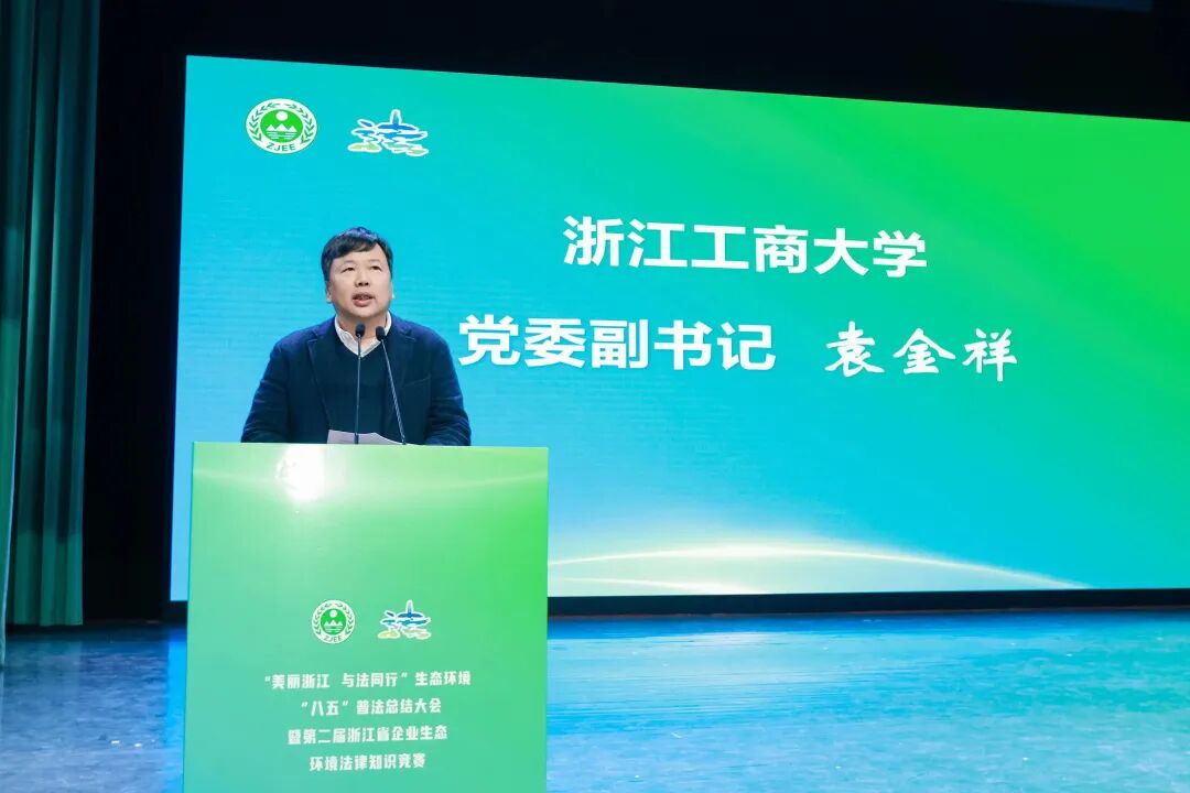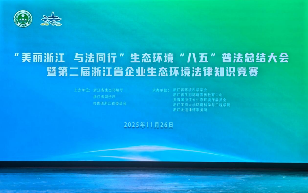 2025年11月26日下午,由浙江省生态环境厅、浙江省司法厅、共青团浙江省委员会主办,浙江省环境科学学会、浙江省生态环境宣传教育中心、共青团浙江省生态环境厅委员会、浙江工商大学环境科学与工程学院、浙江金道律师事务所承办的“美丽浙江 与法同行”生态环境“八五”普法总结大会暨第二届浙江省企业生态环境法律知识竞赛在浙江工商大学举行。