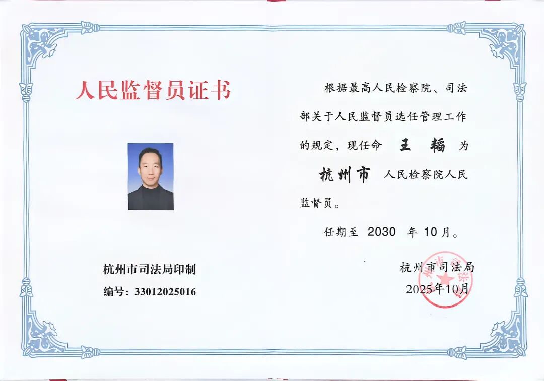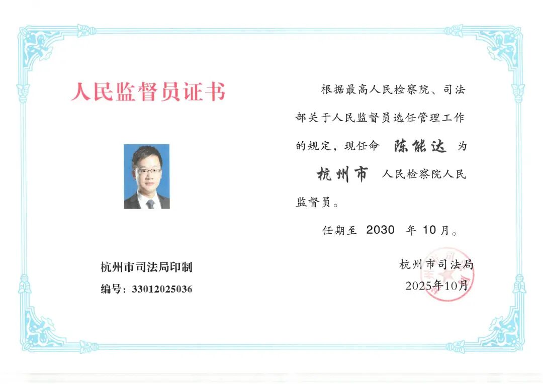 近日,杭州市司法局根据《最高人民检察院司法部关于印发〈人民监督员选任管理办法〉的通知》(司发〔2021〕7号)和《浙江省人民检察院浙江省司法厅关于印发〈浙江省人民监督员选任管理实施细则〉的通知》(浙司〔2022〕51号)等相关规定,经报名、资格审查、组织考察、社会公示等程序,正式公布了新一届市级人民监督员名单。金道所高级合伙人陈能达、王韬被任命为杭州市人民检察院人民监督员,任期五年(自2025年10月31日至2030年10月30日)。