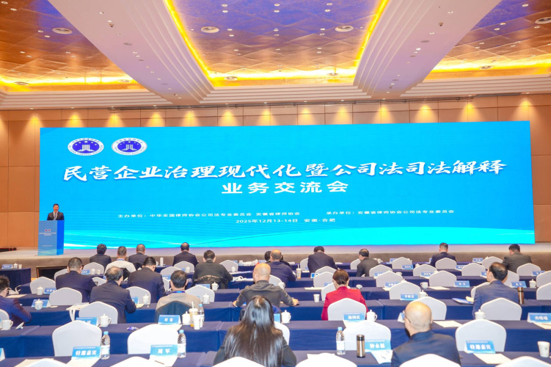 2025年12月13日-14日,中华全国律师协会公司法专业委员会、安徽省律师协会公司法专业委员会在合肥共同举办“民营企业治理现代化暨公司法司法解释”业务交流会。全国律协副会长蒋敏,安徽省司法厅律师工作处处长、省律师行业党委副书记谢思泽出席开幕式并致辞。全国律协公司法专业委员会主任吴晨主持开幕式。中华全国律师协会业务部、安徽省司法厅律师工作处、安徽省律师协会负责人出席交流会,中华全国律师协会公司法专业委员会全体委员、安徽省律师协会公司法专业委员会全体委员、部分省市律师协会代表、律师共计350余人参加会议。中华全国律师协会公司法专业委员会副主任、金道所党委书记、主任王全明和《公司纠纷律师事务指引》编审组成员、金道所合伙人王杰受邀参加活动。