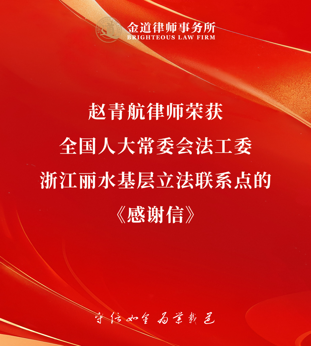 金道喜讯 | 赵青航律师荣获全国人大常委会法工委浙江丽水基层立法联系点的《感谢信》