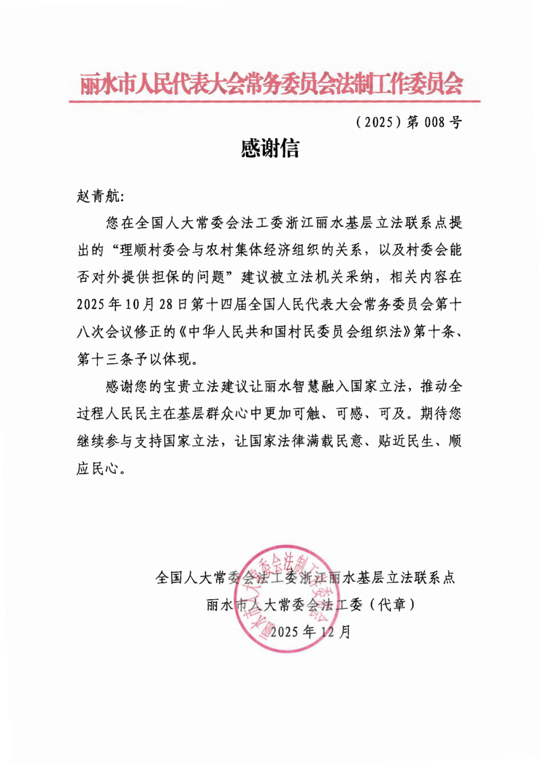 《感谢信》指出,赵青航博士提出的“理顺村委会与农村集体经济组织的关系,以及村委会能否对外提供担保的问题”建议被立法机关采纳,相关内容在2025年10月28日第十四届全国人民代表大会常务委员会第十八次会议修正的《中华人民共和国村民委员会组织法》第十条、第十三条予以体现。
