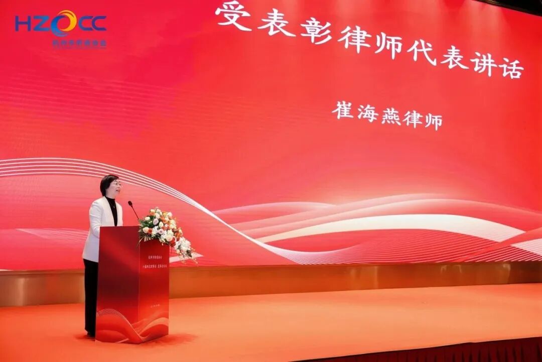 党委委员崔海燕带领王韬、林晓芳律师组成的诉讼案件团队荣获杭州市侨商协会表彰,被授予“依法护侨彰正义,倾情为侨暖侨心”荣誉称号,崔律师作为受表彰律师代表上台讲话,并作企业合规讲座。