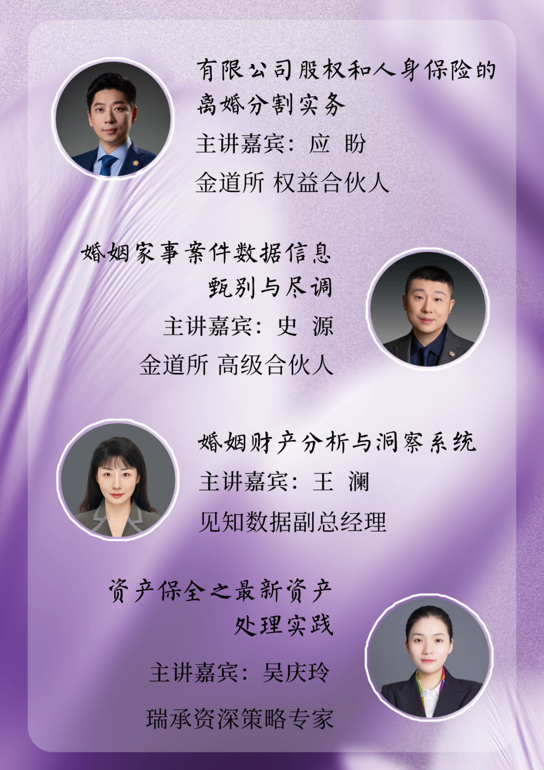 本次分享会由金道律师事务所携手瑞承家办、见知数据举办,旨在聚焦婚姻财富管理中的前沿实务问题。帮助与会者构建起从风险识别、资产隔离到权益保障的全链条思维,为应对复杂家事案件与财富传承挑战提供切实可行的解决路径。